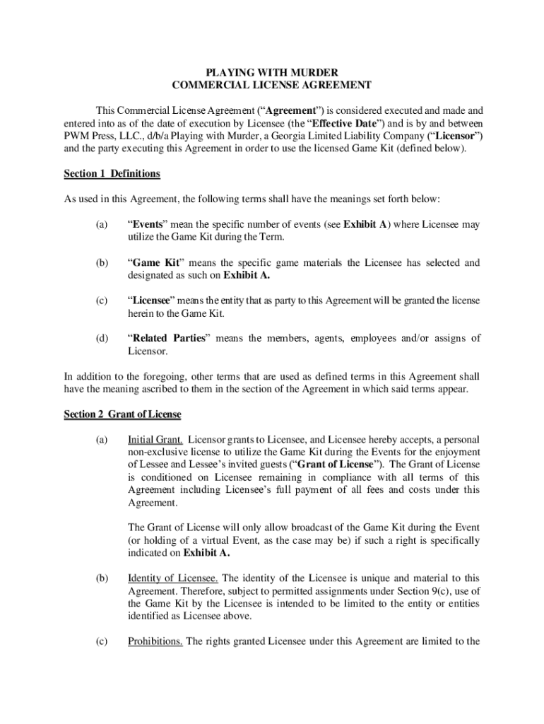 PLAYING WITH MURDER COMMERCIAL LICENSE AGREEMENT This Commercial License Agreement (Agreement) is considered executed and made and entered into as of the date of execution by Licensee (the Effective