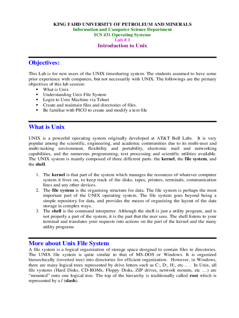 KING FAHD UNIVERSITY OF PETROLEUM AND MINERALS Information and Computer Science Department ICS 431 Operating Systems Lab # 1Introduction to UnixObjectives: This Lab is for new users of the UNIX time-sharing