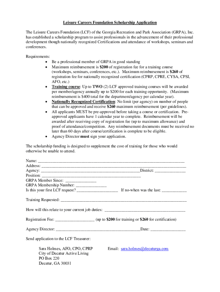 Leisure Careers Foundation Scholarship Application The Leisure Careers Foundation (LCF) of the Georgia Recreation and Park Association (GPA), Inc. has established a scholarship program to assist professionals
