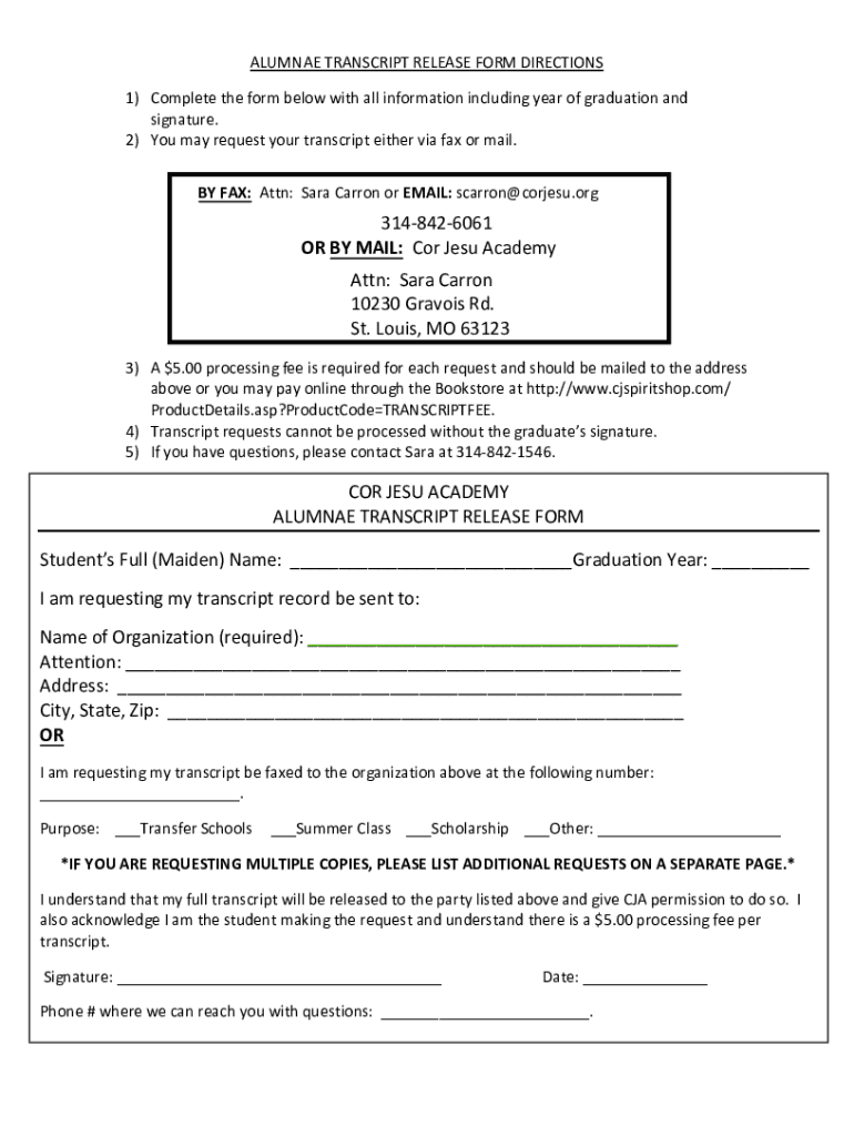 Former students or alumni are required to file the alumnae transcript release form in order to authorize the release of their academic records.