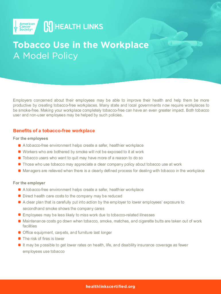 Tobacco Use in the Workplace A Model PolicyEmployers concerned about their employees may be able to improve their health and help them be more productive by creating tobacco free workplaces. Many