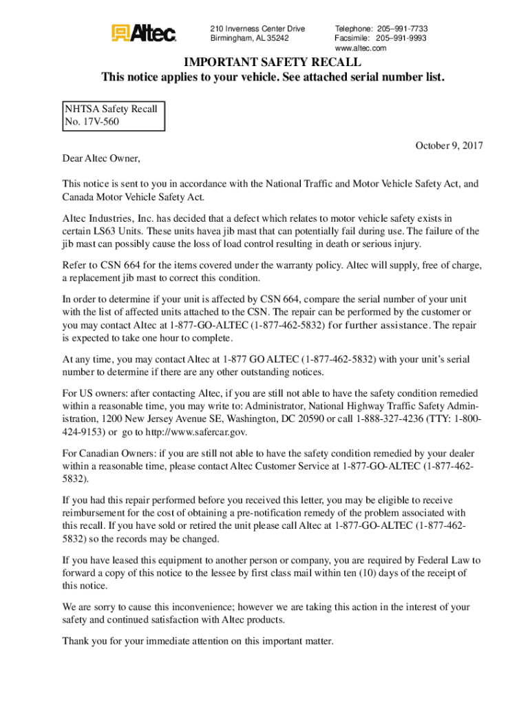 210 Inverness Center Drive Birmingham, AL 35242Telephone: 2059917733 Facsimile: 2059919993 www.altec.comIMPORTANT SAFETY RECALL This notice applies to your vehicle. See attached serial number list.