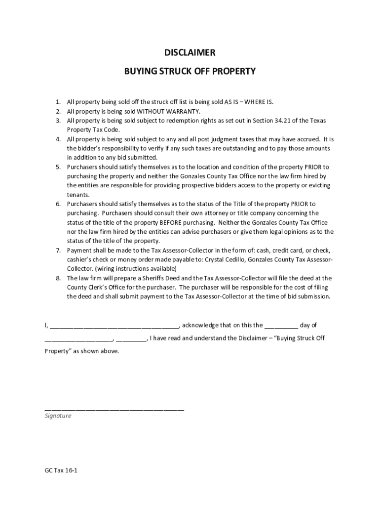 DISCLAIMERBUYINGSTRUCKOFFPROPERTY 1. AllpropertybeingsoldoffthestruckofflistisbeingsoldASISWHEREIS. 2. AllpropertyisbeingsoldWITHOUTWARRANTY. 3. AllpropertyisbeingsoldsubjecttoredemptionrightsassetoutinSection34.21oftheTexas