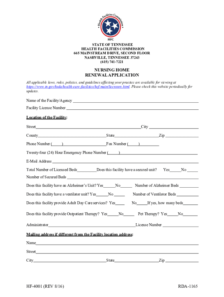 STATE OF TENNESSEE HEALTH FACILITIES COMMISSION 665 MAINSTREAM DRIVE, SECOND FLOOR NASHVILLE, TENNESSEE 37243 (615) 7417221NURSING HOME RENEWAL APPLICATION All applicable laws, rules, policies, and