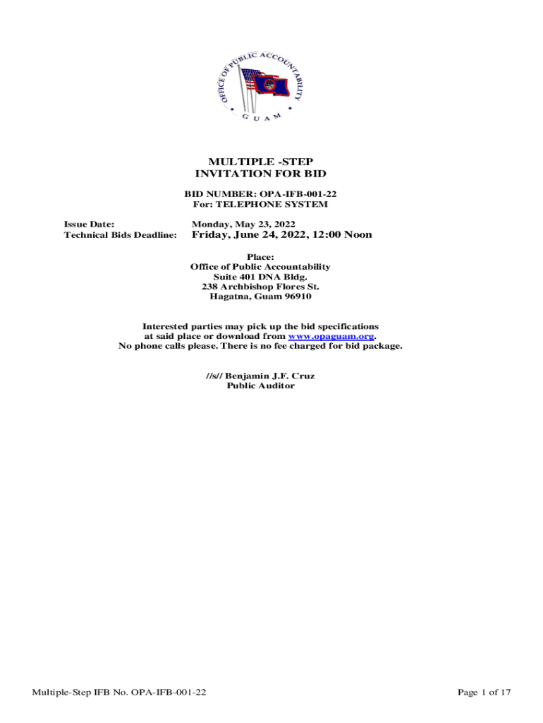 MULTIPLE STEP INVITATION FOR BID NUMBER: OPAIFB00122 For: TELEPHONE SYSTEM Issue Date: Technical Bids Deadline:Monday, May 23, 2022Friday, June 24, 2022, 12:00 Noon Place: Office of Public Accountability
