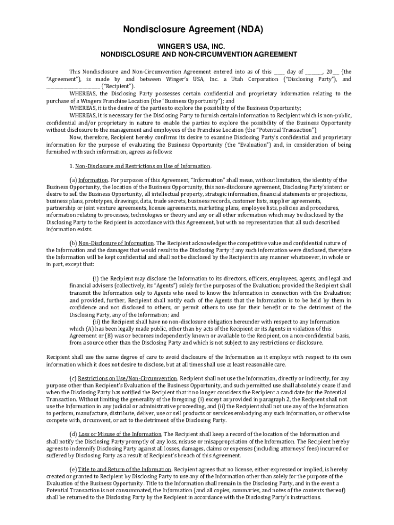 Nondisclosure Agreement (NDA) WINGERS USA, INC. NONDISCLOSURE AND CIRCUMVENTION AGREEMENT This Nondisclosure and Circumvention Agreement entered into as of this ___ day of ___, 20___ (the Agreement),
