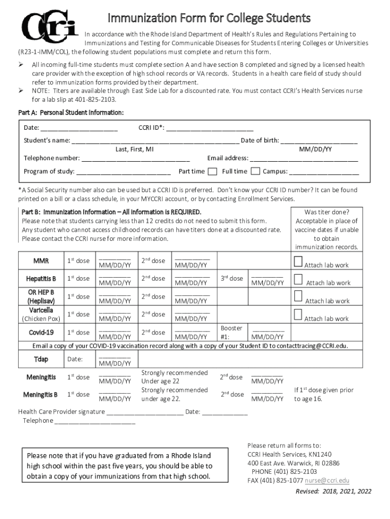 Immunization Form for College Students In accordance with the Rhode Island Department of Health Rules and Regulations Pertaining to Immunizations and Testing for Communicable Diseases for Students