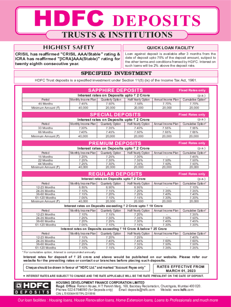 HDFCDEPOSITSTRUSTS & INSTITUTIONSHIGHEST SAFETYQUICK LOAN FACILITYCRISIL has reaffirmed \” CRISIS AAA/Stable\” rating & ICRA has reaffirmed \”[ICRA]AAA(Stable)\” rating for twenty-eighth consecutive