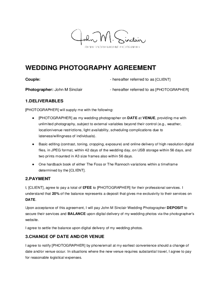 WEDDING PHOTOGRAPHY AGREEMENT Couple: hereafter referred to as [CLIENT]Photographer: John M Sinclair hereafter referred to as [PHOTOGRAPHER]1.DELIVERABLES [PHOTOGRAPHER] will supply me with the following: