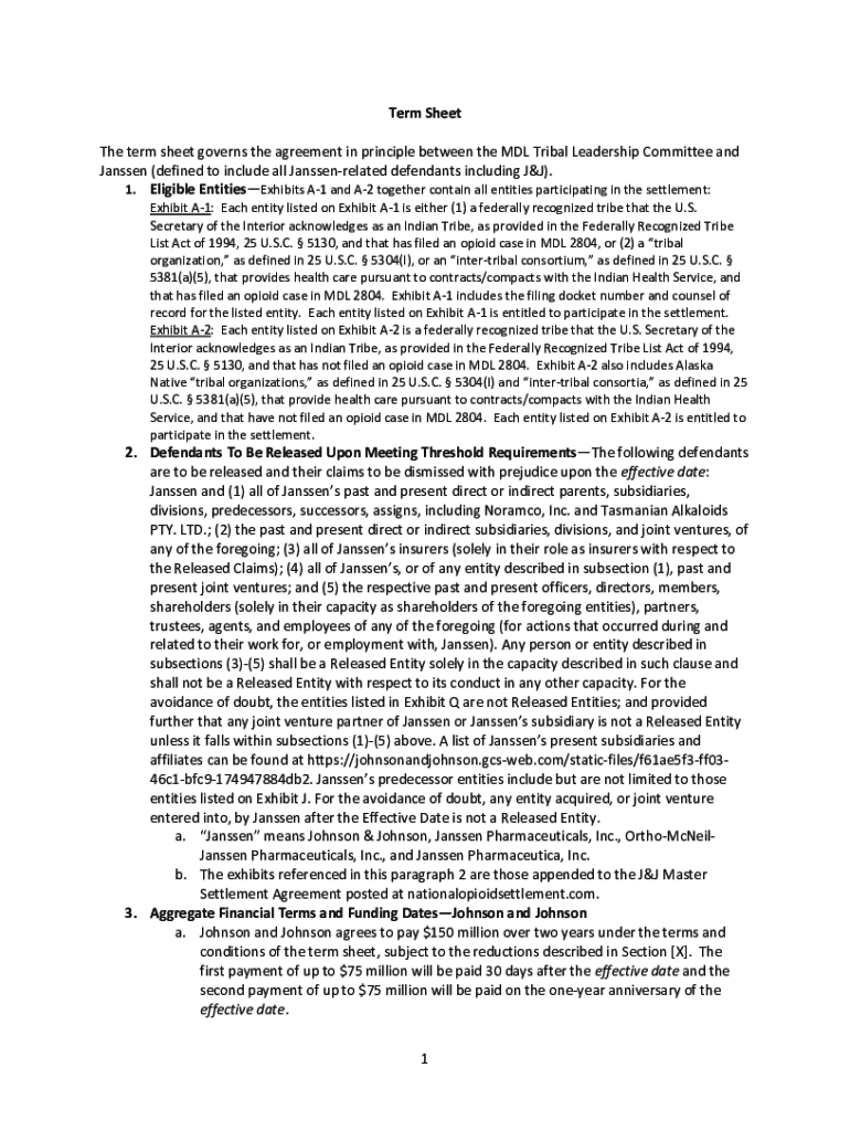 Term Sheet The term sheet governs the agreement in principle between the MDL Tribal Leadership Committee and Janssen (defined to include all Janssenrelated defendants including J&J). 1. Eligible EntitiesExhibits