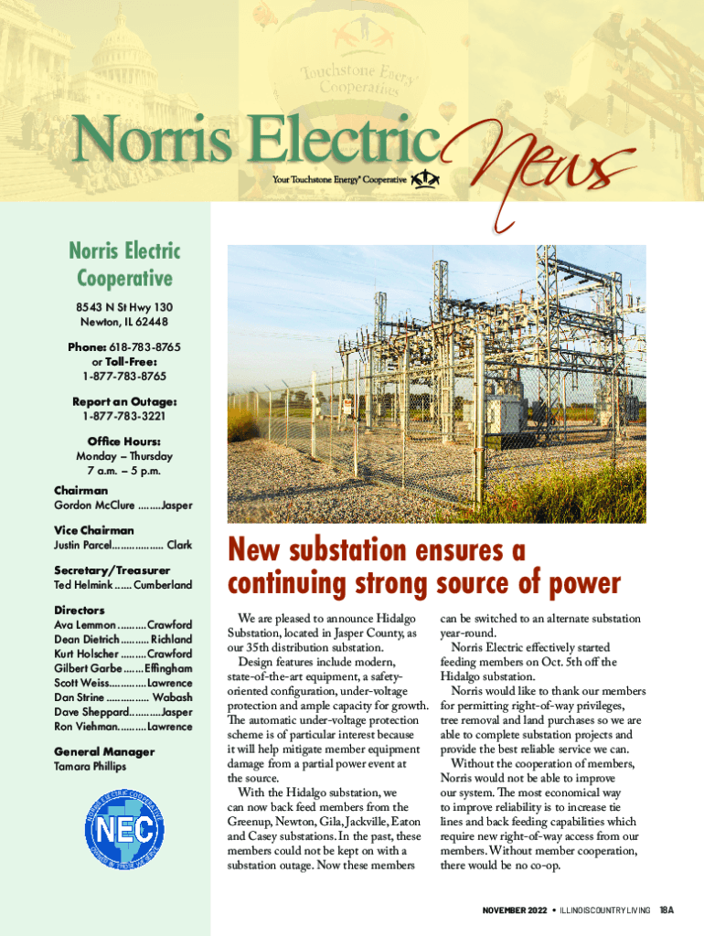 Norris Electric Cooperative 8543 N St Hwy 130 Newton, IL 62448 Phone: 6187838765 or Toll-free: 18777838765 Report an Outage: 18777833221 Office Hours: Monday Thursday 7 a.m. 5 p.m. Chairman Gordon