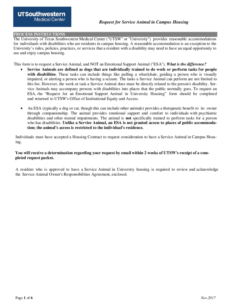 Request for Service Animal in Campus Housing PROCESS INSTRUCTIONS The University of Texas Southwestern Medical Center (\” UT SW\” or \” University\”) provides reasonable accommodations for