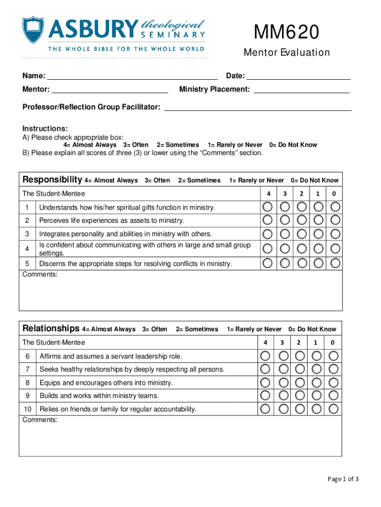 MM620Mentor Evaluation Name: ___ Mentor: ___Date: ___Ministry Placement: ___Professor/Reflection Group Facilitator: ___ Instructions: A) Please check appropriate box: 4 Almost Always3 Often2 Sometimes1