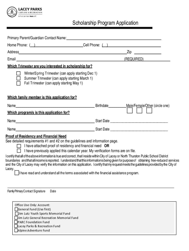 Scholarship Program Application Primary Parent/Guardian Contact Name: Home Phone: ()Cell Phone: ()AddressZipEmail(REQUIRED)Which Trimester are you interested in scholarship for? Winter/Spring Trimester