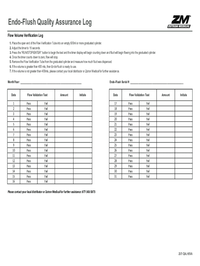 EndoFlush Quality Assurance Log Flow Volume Verification Log 1. Place the open end of the Flow Verification Tube into an empty 500ml or more graduated cylinder. 2. Adjust the timer to 15 seconds.