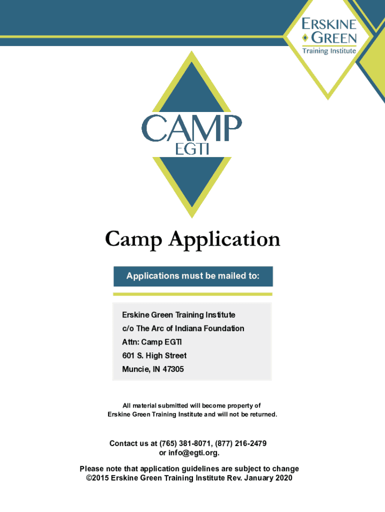Camp Application Applications must be mailed to:Ermine Green Training Institute c/o The Arc of Indiana Foundation Attn: Camp EGT 601 S. High Street Muncie, IN 47305All material submitted will become