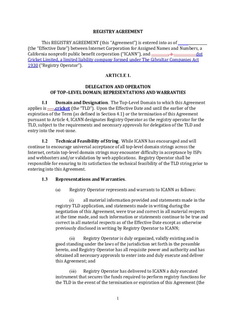 REGISTRYAGREEMENT ThisREGISTRYAGREEMENT(disagreement)isenteredintoasof___ (theEffectiveDate)betweenInternetCorporationforAssignedNamesandNumbers, a Californianonprofitpublicbenefitcorporation(ICANN),