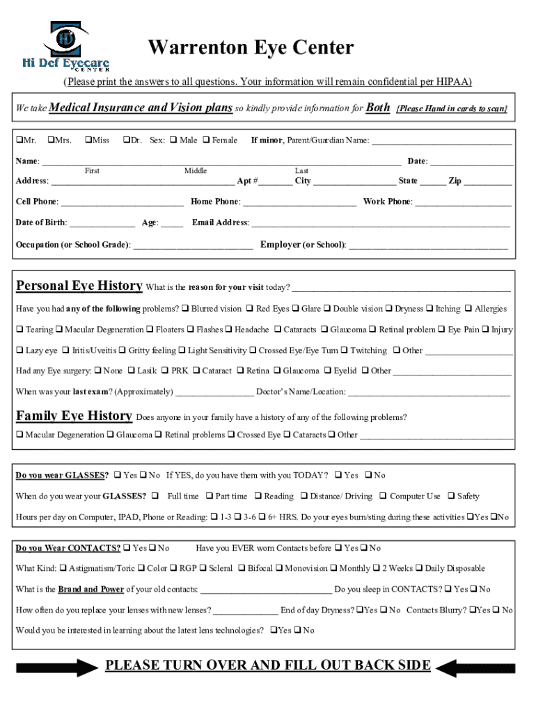 Warren ton Eye Center (Please print the answers to all questions. Your information will remain confidential per HIPAA) We take Medical Mr. Mrs. Insurance and Vision plans so kindly provide information