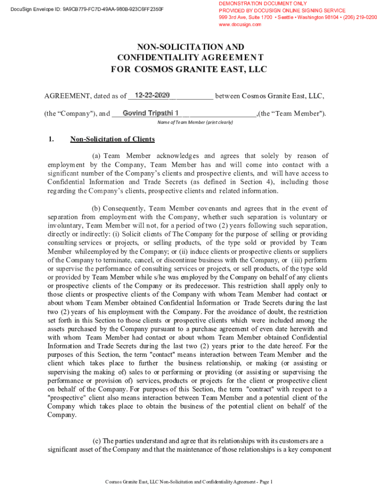 DocuSign Envelope ID: 9A9CB779FC7D49AA980B923C6FF2350FDEMONSTRATION DOCUMENT ONLY PROVIDED BY DocuSign ONLINE SIGNING SERVICE 999 3rd Ave, Suite 1700 Seattle Washington 98104 (206) 2190200 www.docusign.comNONSOLICITATION