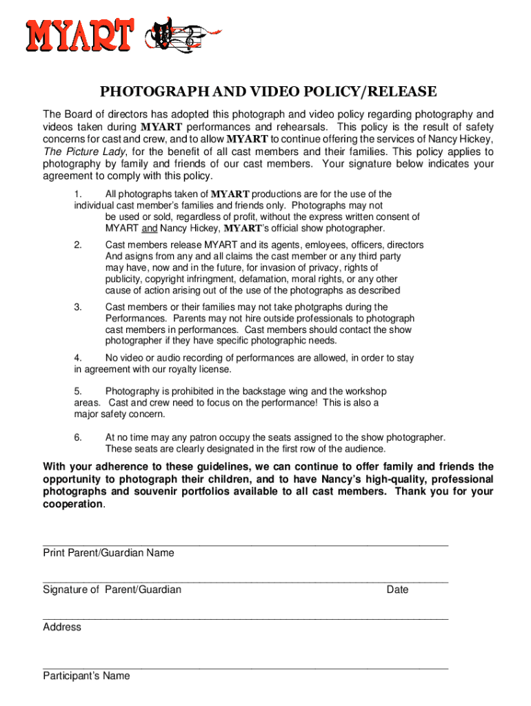 PHOTOGRAPH AND VIDEO POLICY/RELEASE The Board of directors has adopted this photograph and video policy regarding photography and videos taken during MART performances and rehearsals. This policy