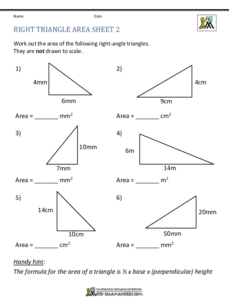NameDateRIGHT TRIANGLE AREA SHEET 2 Work out the area of the following right angle triangles. They are not drawn to scale.1)2) 4mm4cm 6mm9cmArea ___ mm2Area ___ cm23)4) 10mm6m 14m7mm Area ___ mm2Area