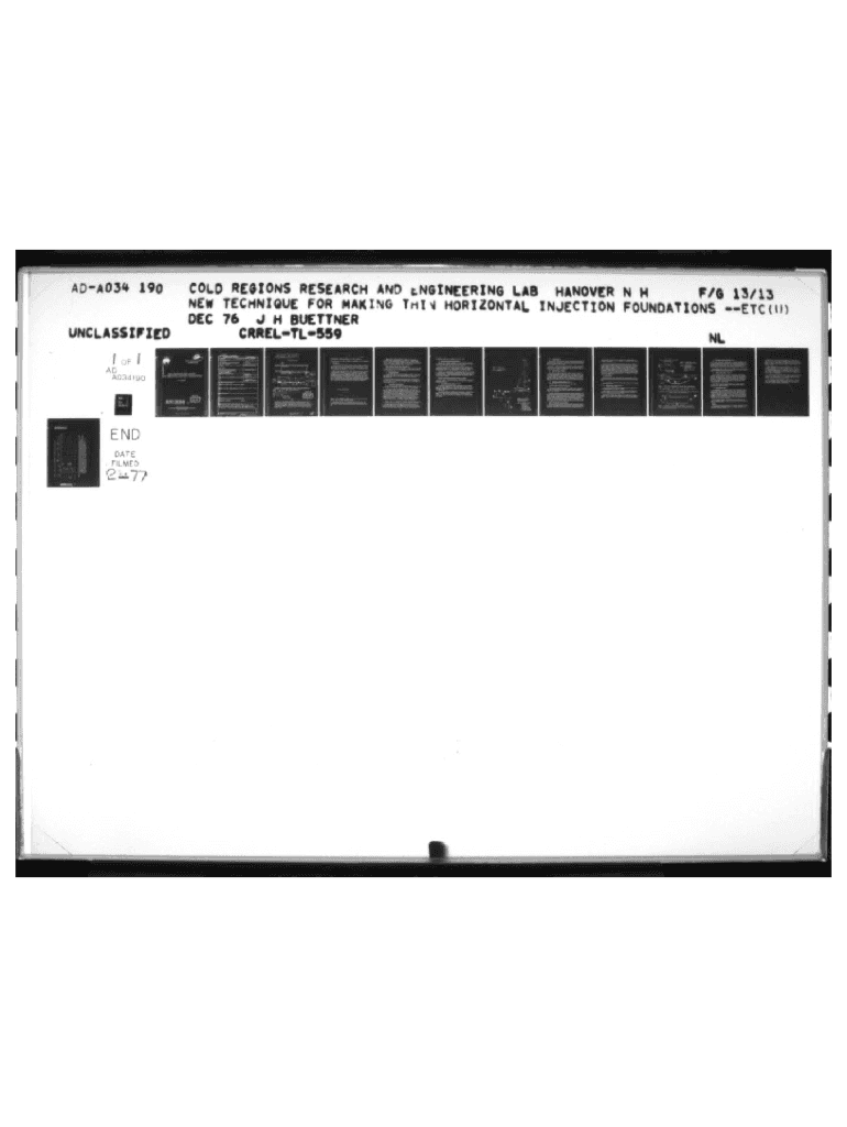 A D *ON 190 UNCLASSIFIEDCOLD REGIONS RESEARCH AND tN$tNtflht4O LAS HANOVER N H F $13 13 NEW TECHNIQUE FOR MAKING TNA 4 Horizontal. INJECTION FOUNDATIONS ETC (II) DCC 76. I H SETTLER. CR×ELTLU9IEND