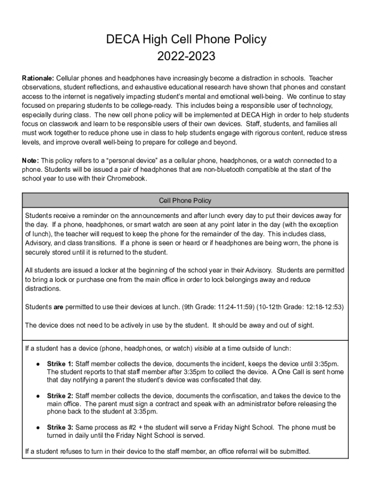 DECA High Cell Phone Policy 20222023 Rationale: Cellular phones and headphones have increasingly become a distraction in schools. Teacher observations, student reflections, and exhaustive educational