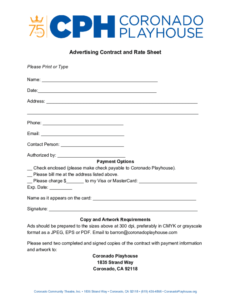 Advertising Contract and Rate Sheet Please Print or Type Name: ___ Date:___ Address: ___ ___ Phone: ___ Email: ___ Contact Person: ___ Authorized by: ___ Payment Options __ Check enclosed (please