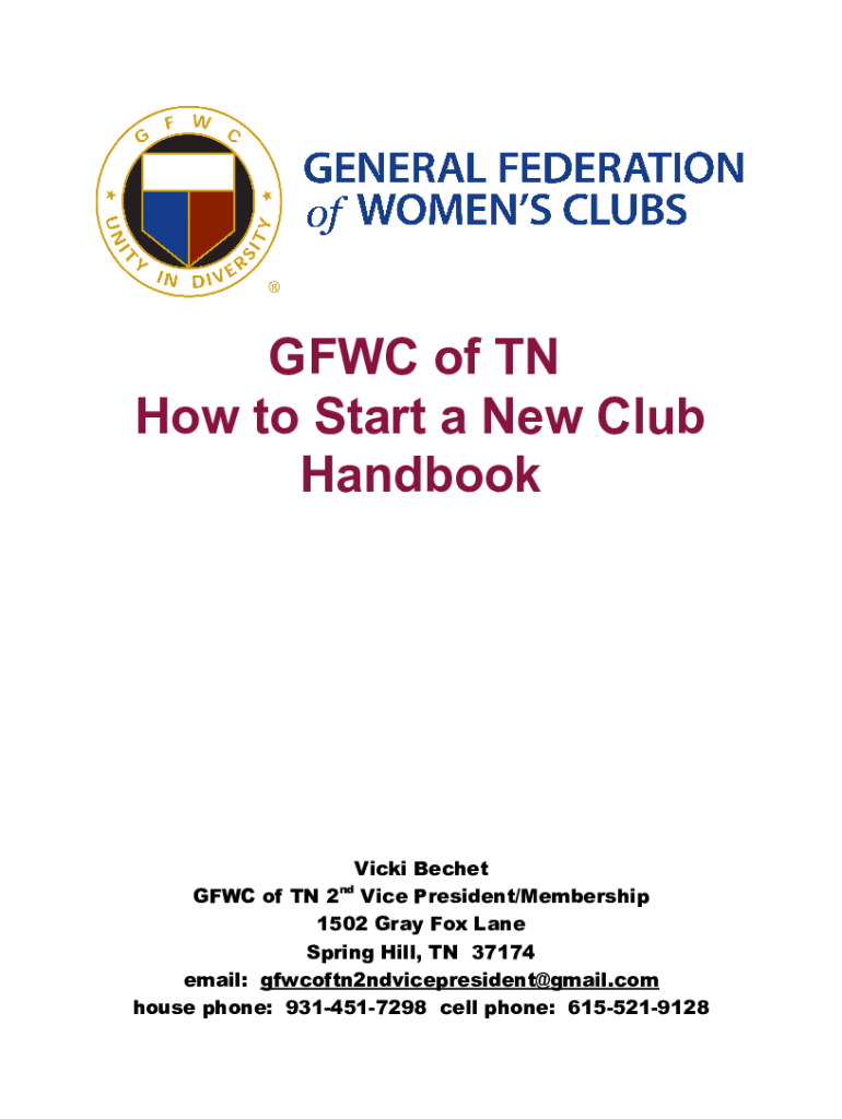 GFWC of TN How to Start a New Club Handbook Vicki Becket GFWC of TN 2nd Vice President/Membership 1502 Gray Fox Lane Spring Hill, TN 37174 email: gfwcoftn2ndvicepresident@gmail.com house phone: 9314517298