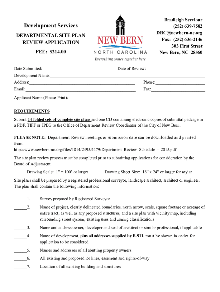 Brayleigh Previous (252) 6397582 DRC@newbernnc.org Fax: (252) 6362146 303 First Street New Bern, NC 28560Development Services DEPARTMENTAL SITE PLAN REVIEW APPLICATION FEE: $214.00Date Submitted:___