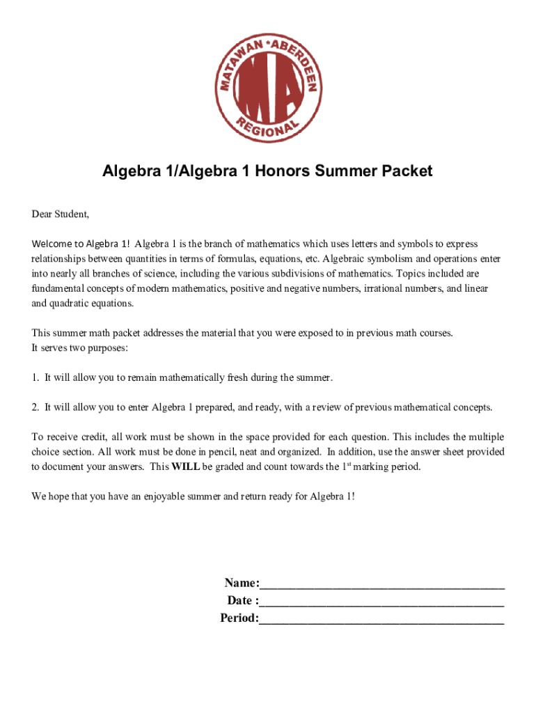 Get the free Algebra 1/Algebra 1 Honors Summer Packet