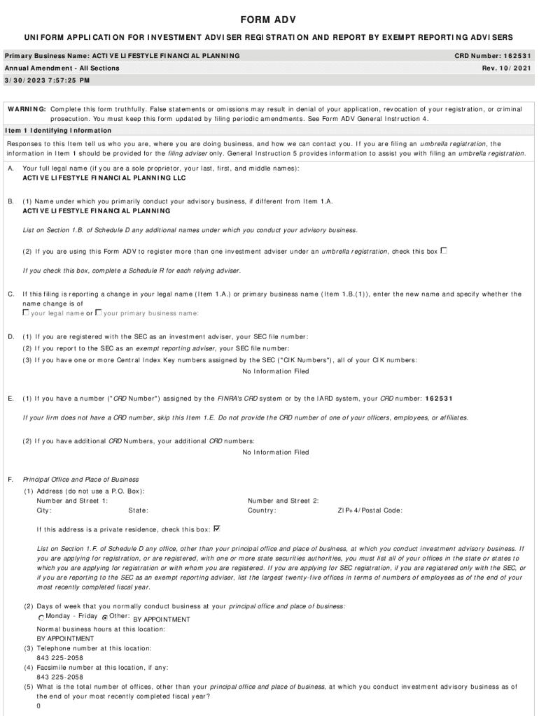 FORM ADV UNIFORM APPLICATION FOR INVESTMENT ADVISER REGISTRATION AND REPORT BY EXEMPT REPORTING ADVISERS Primary Business Name: ACTIVE LIFESTYLE FINANCIAL PLANNING CRD Number: 162531Annual Amendment