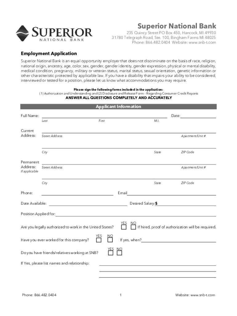 Superior National Bank 235 Quincy Street PO Box 450, Hancock, MI 49930 31780 Telegraph Road, Ste. 100, Bingham Farms MI 48025 Phone: 866.482.0404 Website: www.snbt.comEmployment Application Superior