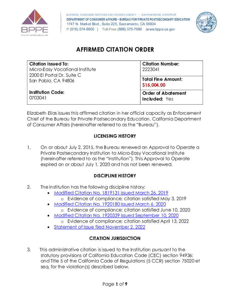 BUSINESS, CONSUMER SERVICES AND HOUSING AGENCY GAVIN NEWSOM, GOVERNORDEPARTMENT OF CONSUMER AFFAIRS BUREAU FOR PRIVATE POSTSECONDARY EDUCATION1747 N. Market Blvd., Suite 225, Sacramento, CA 95834