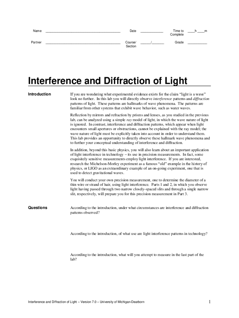 Name___Date___Time to Complete___h ___partner___Course/ Section___/___Grade___Interference and Diffraction of Light Introduction you are wondering what experimental evidence exists for the claim light