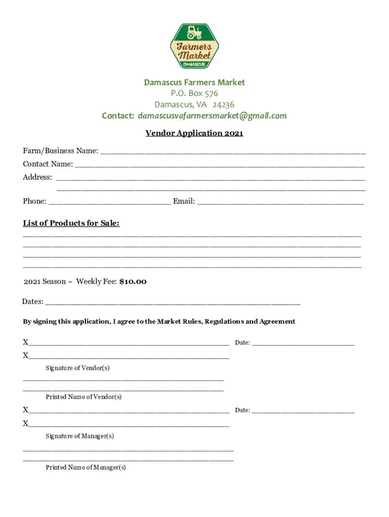 Damascus Farmers Market P.O. Box 576 Damascus, VA 24236 Contact: damascusvafarmersmarket@gmail.com Vendor Application 2021 Farm/Business Name: ___ Contact Name: ___ Address: ___ ___ Phone: ___ Email: