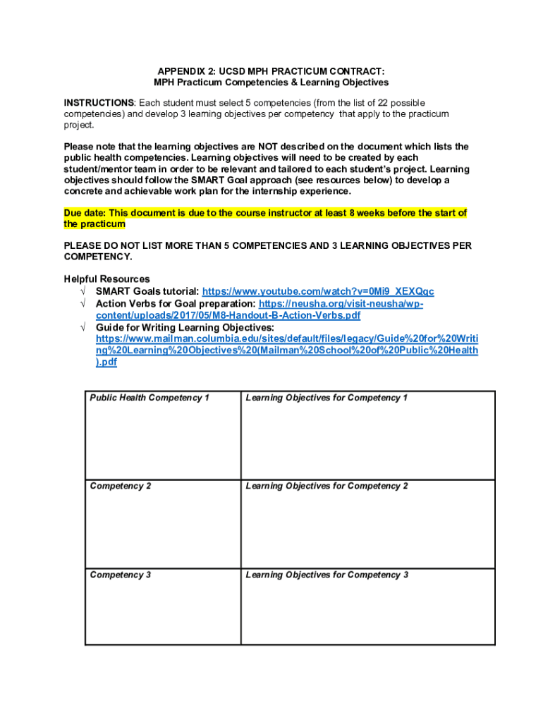APPENDIX 2: UCSD MPH PRACTICUM CONTRACT: MPH Practicum Competencies & Learning Objectives INSTRUCTIONS: Each student must select 5 competencies (from the list of 22 possible competencies) and develop