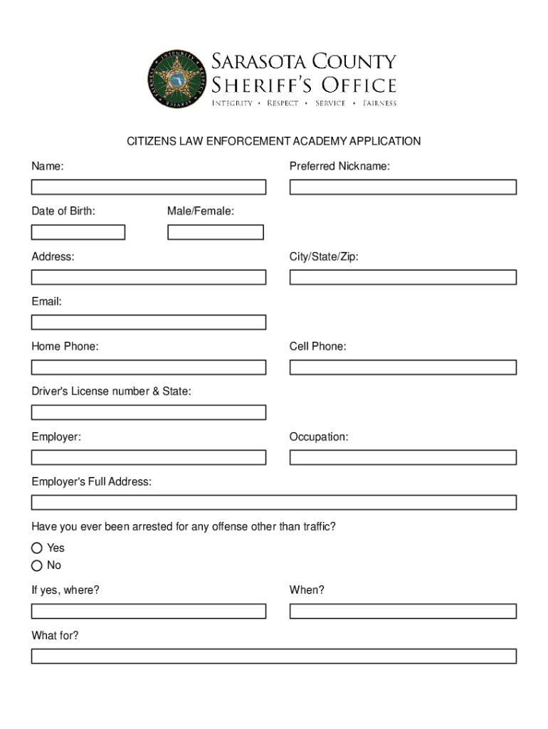 CITIZENS LAW ENFORCEMENT ACADEMY APPLICATION Name:Date of Birth:Preferred Nickname:Male/Female:Address:City/State/Zip:Email:Home Phone:Cell Phone:Driver\'s License number & State:Employer:Occupation:Employer\'s