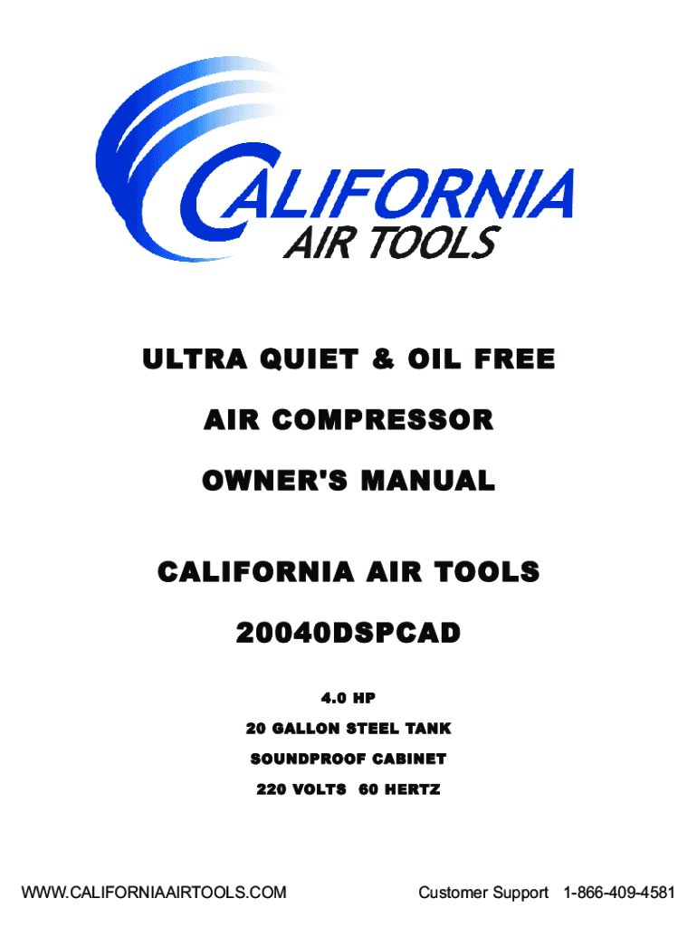 ULTRA QUIET & OIL FREE AIR COMPRESSOR OWNER\'S MANUAL CALIFORNIA AIR TOOLS 20040DSPCAD 4.0 HP 20 GALLON STEEL TANK SOUNDPROOF CABINET 220 VOLTS 60 HERTZ WWW.CALIFORNIAAIRTOOLS. Customer Support 18664094581AIR