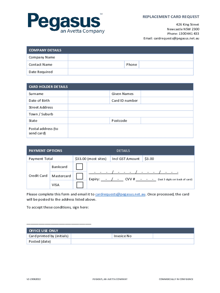 REPLACEMENT CARD REQUEST 426 King Street Newcastle NSW 2300 Phone: 1300 441 433 Email: cardrequests@pegasus.net.auCOMPANY DETAILS Company Name Contact NamePhoneDate RequiredCARD HOLDER DETAILS SurnameGiven