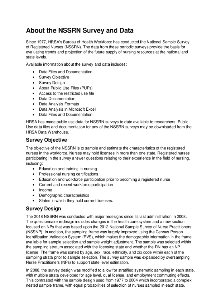 About the NSS RN Survey and Data Since 1977, HRS As Bureau of Health Workforce has conducted the National Sample Survey of Registered Nurses (NSS RN). The data from these periodic surveys provide