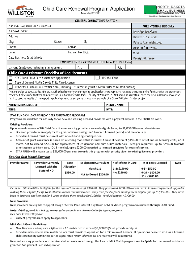 Child Care Renewal Program Application Amended 2/1/17-STAR FUND CHILD CARE PROVIDERS ASSISTANCE PROGRAM Programs are available for annually for all new and existing licensed providers with a physical