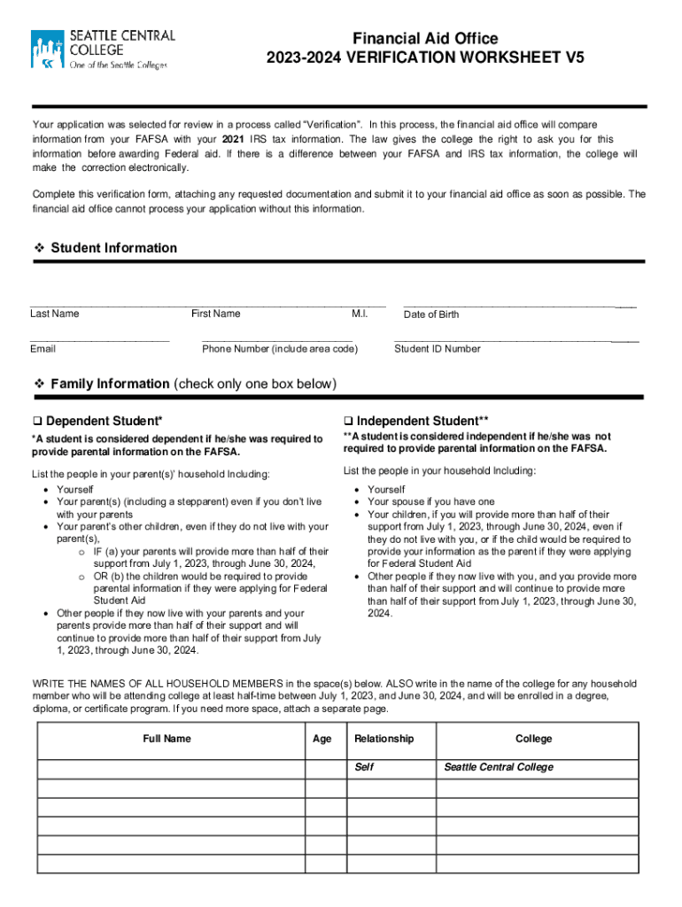 Financial Aid Office 20232024 VERIFICATION WORKSHEET V5Your application was selected for review in a process called Verification. In this process, the financial aid office will compare information