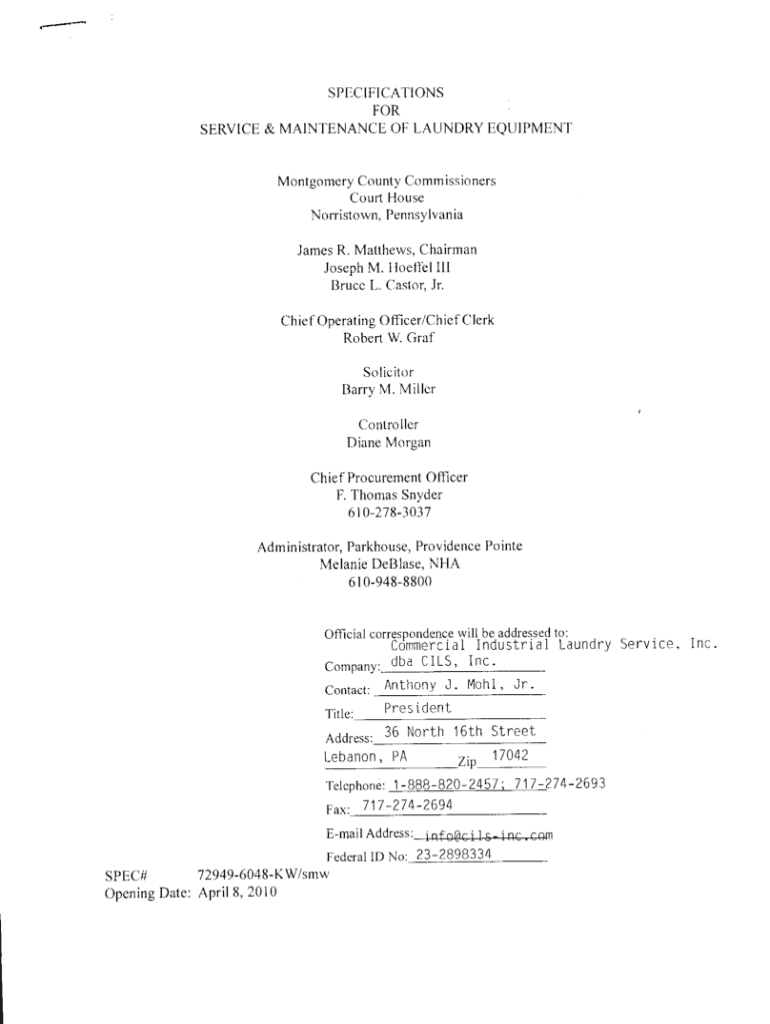 SPECIFICATIONS FOR SERVICE & MAINTENANCE OF LAUNDRY EQUIPMENT Montgomery County Commissioners Court House Norristown, Pennsylvania James R. Matthews, Chairman Joseph M. I Loeffler III Bruce L. Castor,