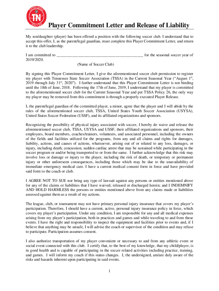 Player Commitment Letter and Release of Liability My son/daughter (player) has been offered a position with the following soccer club. I understand that to accept this offer, I, as the parent/legal