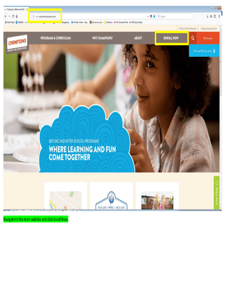 Navigate to the main website and click Enroll Now. To enroll, log into your online Champions account. If this is your first time enrolling in a Champions program you will need to create an online