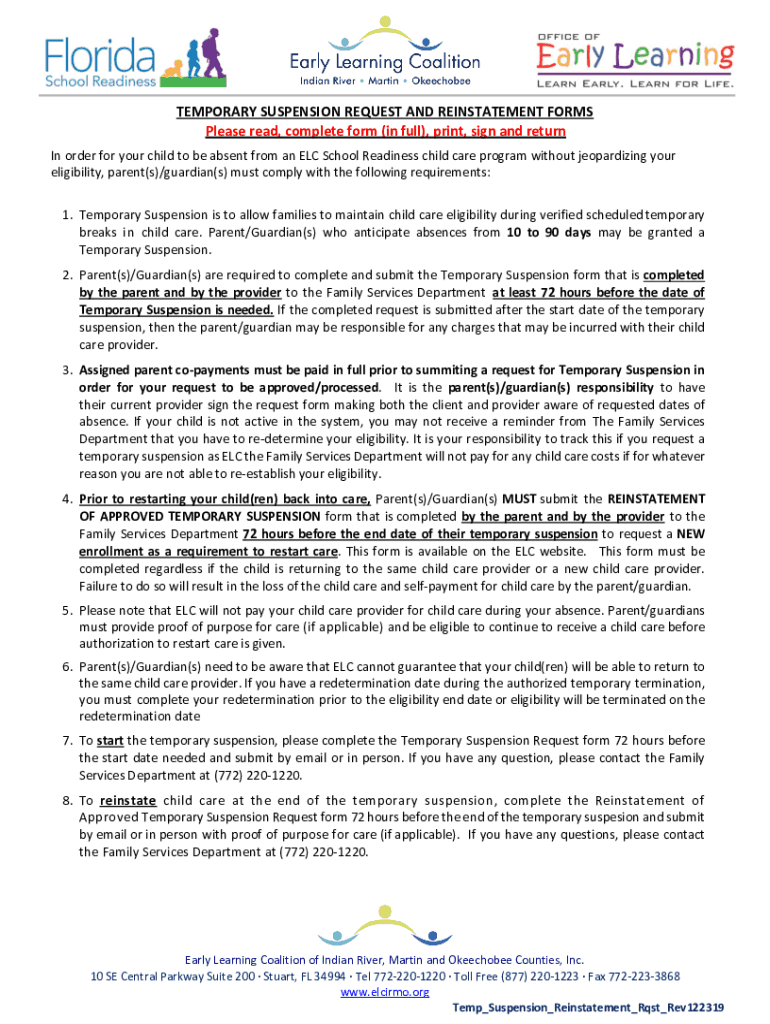 TEMPORARY SUSPENSION REQUEST AND REINSTATEMENT FORMS Please read, complete form (in full), print, sign and return In order for your child to be absent from an ETC School Readiness child care program