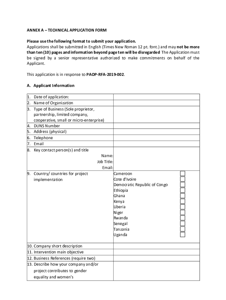 ANNEXATECHNICALAPPLICATIONFORM Pleaseusethefollowingformattosubmityourapplication. ApplicationsshallbesubmittedinEnglish(TimesNewRoman12pt.font.)andmaynotbemore than ten(10)pagesandinformationbeyondpagetenwillbedisregardedTheApplicationmust