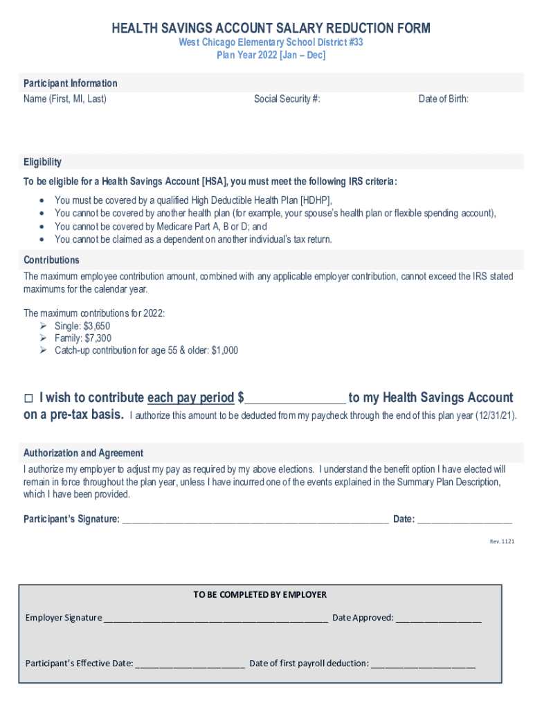 HEALTH SAVINGS ACCOUNT SALARY REDUCTION FORM West Chicago Elementary School District #33 Plan Year 2022 [Jan Dec] Participant Information Name (First, MI, Last)Social Security #:Date of Birth:Eligibility