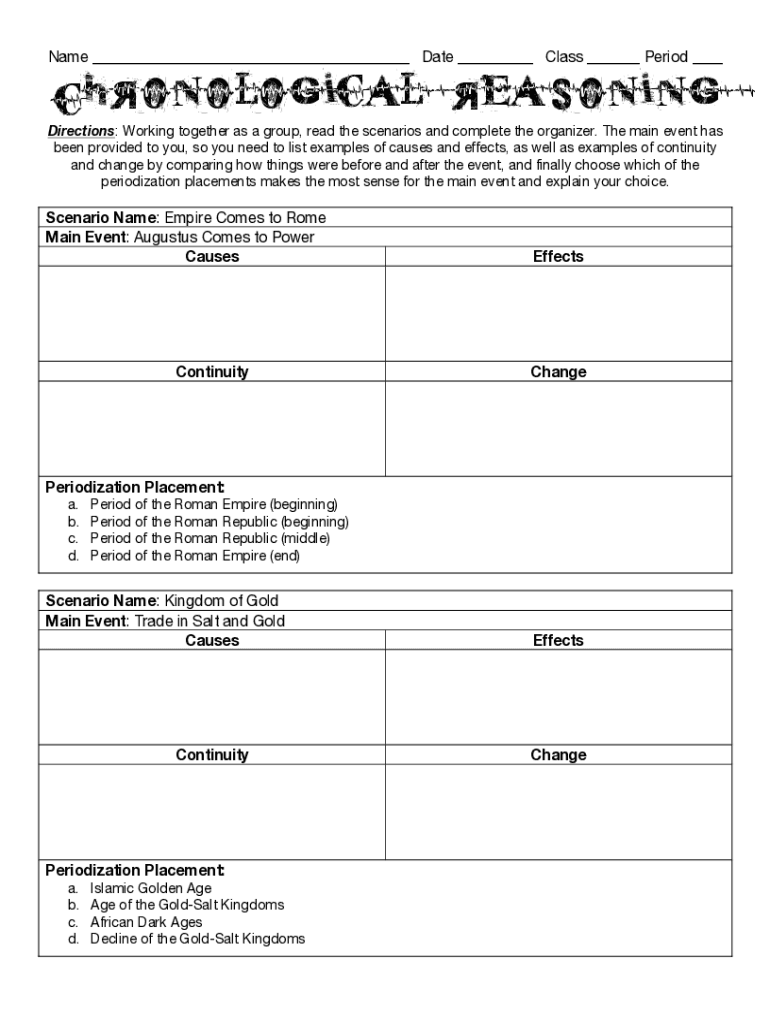 Name ___ Date ___ Class ___ Period ___Chronological Reasoning Directions: Working together as a group, read the scenarios and complete the organizer. The main event has been provided to you, so you